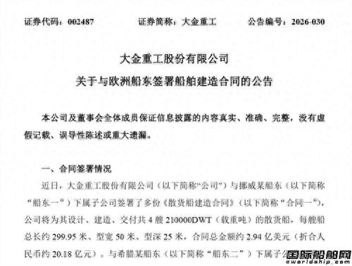 4月23日晚间,大金重工股份有限公司宣布,与挪威某船东下属子公司、希腊某船东下属子公司签署了多份《散货船建造合同》,将分别为其设计、建造、交付各4艘210000载重吨散货船。上述船舶将于2028-2029年分批交付,每艘船总长约299.95米、型宽50米、型深25米。
